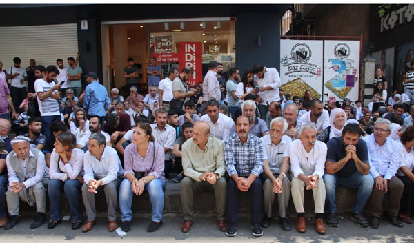 Diyarbakır merkez Yenişehir ilçesi AZC Plaza önünde toplanan HDP milletvekilleri ve partililer, güvenlik güçleri ve TOMA’larla ablukaya alındı. Açıklama sırasında sık sık sloganlar atılırken, TİP Genel Başkan Yadımcısı Barış Atay, Diyarbakır Büyükşehir Belediyesi’nin görevdene alınan Eşbaşkanı Selçuk Mızraklı, KKP Genel Başkanı Sinan Çiftyürek, Kürt parti temsilcileri ve HDP milletvekilleri katıldı.